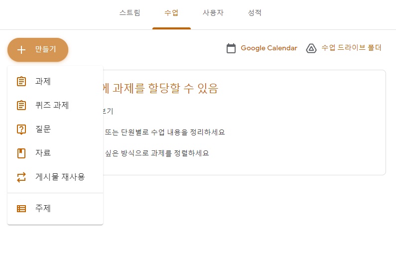 수업을 생성할 수 있으며 과제 퀴즈 과제 질문 자료 이러한 자료를 업로드할 수 있다.